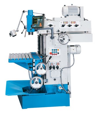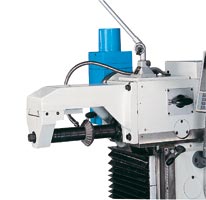 einem vertikalen Fräskopf ausgerüstet, der um +/- 90° geschwenkt werden kann. Eine Gradskala erleichtert das Ablesen der eingestellten Gradzahl. Die Pinole ist großdimensioniert, hat einen Hub von 80 mm und wird mechanisch über einen Hebel geklemmt. Der Einsatz der Horizontal- fräseinrichtung erfolgt nach Demontage des Vertikalfräskopfes mittels Schwenkvorrichtung, des Verschiebens des Oberbalkens, sowie der Montage des Gegenhalters. Umbau- und Rüstkosten sind sehr gering. Alle 3 Achsen der Maschine verfügen über automatische Vorschübe und Eilgänge. Die Achsen X und Z werden über einen einzigen Richtungshebel ein- und ausgeschaltet. Für den Quervorschub Y steht ein separater Hebel am Oberbalken zur Verfügung. Darüber hinaus können die Achsen über skalierte Handräder manuell verfahren werden. |